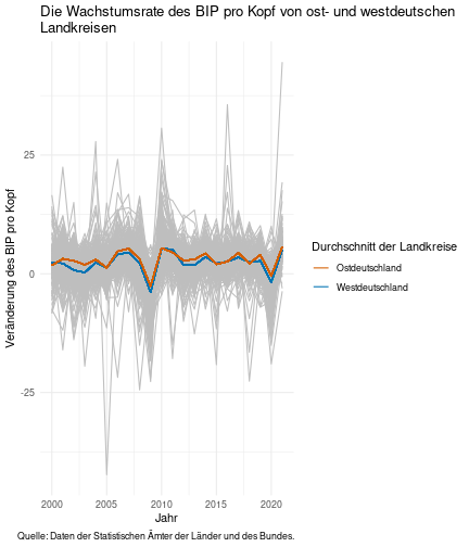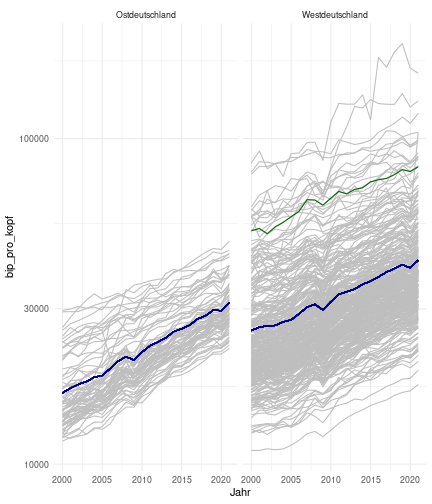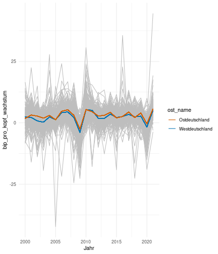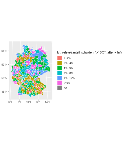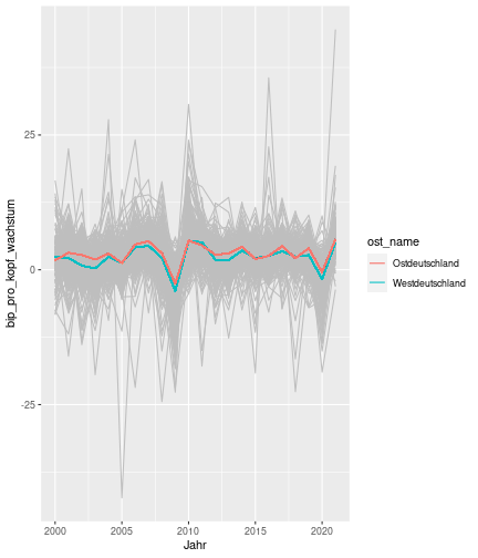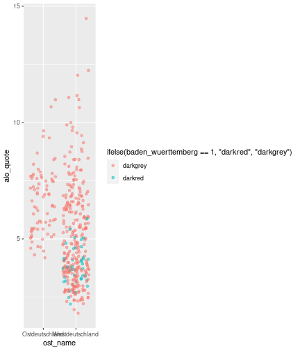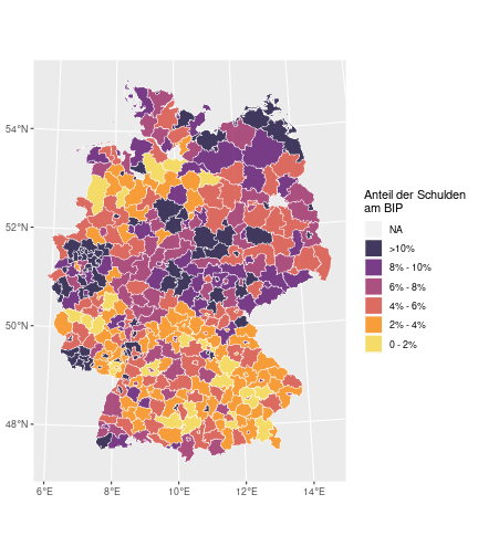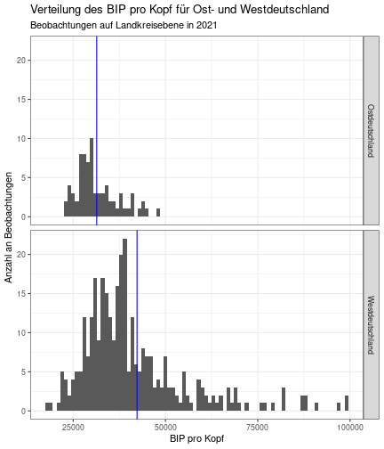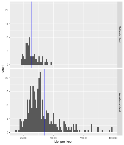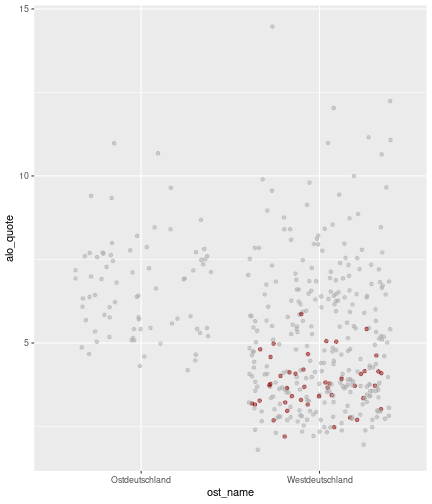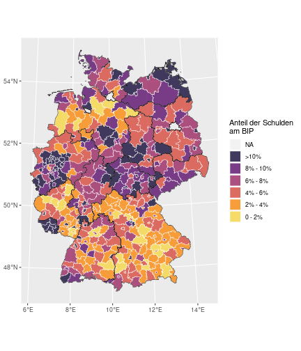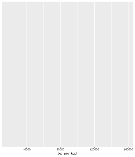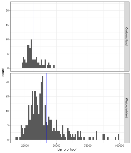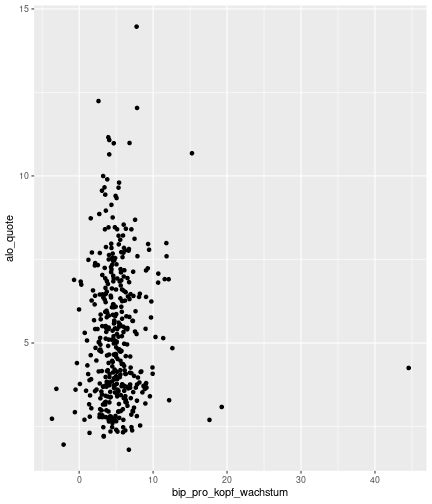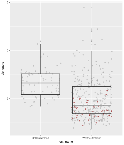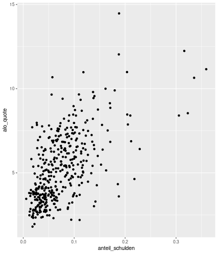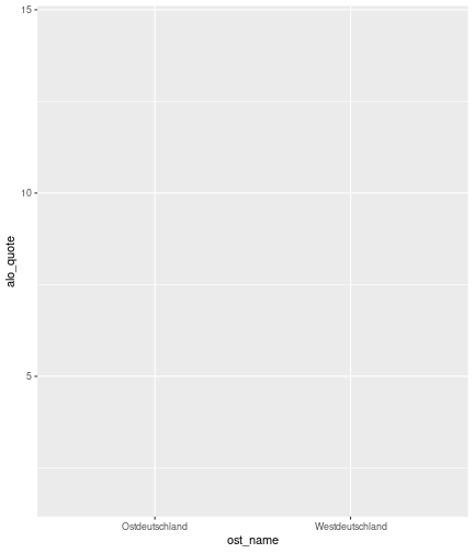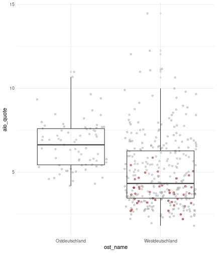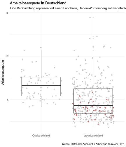 --- ## Arbeitslosenquote Mittelwert: 5,28 Prozent - Sehr hoch - Jedoch SGB II und SGB III - Konsistenzcheck auf [Statista](https://de.statista.com/statistik/daten/studie/1224/umfrage/arbeitslosenquote-in-deutschland-seit-1995/) zeigt eine Arbeitslosenquote von 5,7% für 2021 - **Jedoch:** Wir haben nicht Berlin und Hamburg in den Daten Standardabweichung: 2,07 - Sehr hohe Streuung - Deutliche regionale Unterschiede - Ist in Prozentpunkten Median: 5,00 Prozent - Nahe am Mittelwert - Deutet darauf hin das es wenige Landkreise mit sehr extremen Ausreißern gibt --- ## Verschuldung pro Kopf Mittelwert: 2920€ - Moderat von der Höhe her Standardabweichung: 2272€ - Sehr hohe Streuung - Deutliche regionale Unterschiede Median: 2256€ - Weiter weg vom Mittelwert - Deutet darauf hin das es einzelne Landkreise mit sehr extremen Ausreißern gibt --- ## BIP pro Kopf Mittelwert: 40241€ - Insgesamt recht hoch - Starker Wirtschaftsstandort Deutschland Standardabweichung: 16714€ - Sehr hohe Streuung - Deutliche regionale Unterschiede - Könnte von einzelnen Landkreisen getrieben werden Median: 36497€ - Weiter weg vom Mittelwert - Deutet darauf hin das es einzelne Landkreise mit sehr extremen Ausreißern gibt --- class: inverse, center, middle # Die Arbeitslosenquote auf Bundeslandebene --- ## Die Arbeitslosenquote auf Bundeslandebene .instructions[Es gibt deutliche Unterschiede in der Arbeitslosenquote über die Bundesländer hinweg!] Wir betrachten: - Querschnittsdaten aus 2021 - Alle Landkreise - Für einige Landkreise haben wir keine Informationen (sogenannte "Missing values" -> `n_missing`) .question[Was wollen wir?] Die regionale Verteilung der Arbeitslosenquote in Deutschland im Jahr 2021 näher betrachten. --- ## Die Arbeitslosenquote auf Bundeslandebene Zuerst aggregieren wir die Daten auf Bundeslandebene: ```r bula_data <- gesamtdaten %>% group_by( bundesland_name ) %>% summarise(mean_alo = mean(alo_quote), sd_alo = sd(alo_quote), median_alo = median(alo_quote)) %>% ungroup() ``` --- ## Die Arbeitslosenquote auf Bundeslandebene count: false .panel1-bula_data-auto[ ```r *gesamtdaten ``` ] .panel2-bula_data-auto[ ``` ## # A tibble: 400 × 12 ## Regionalschluessel total_alo landkreis_name bundesland bundesland_name ## <chr> <dbl> <chr> <chr> <chr> ## 1 01001 4369. Flensburg 01 Schleswig-Holste… ## 2 01002 11097. Kiel 01 Schleswig-Holste… ## 3 01003 9347. Lübeck 01 Schleswig-Holste… ## 4 01004 3771. Neumünster 01 Schleswig-Holste… ## 5 01051 4143. Dithmarschen 01 Schleswig-Holste… ## 6 01053 5603. Herzogtum Lauenburg 01 Schleswig-Holste… ## 7 01054 4699 Nordfriesland 01 Schleswig-Holste… ## 8 01055 5371 Ostholstein 01 Schleswig-Holste… ## 9 01056 9371. Pinneberg 01 Schleswig-Holste… ## 10 01057 2854. Plön 01 Schleswig-Holste… ## # ℹ 390 more rows ## # ℹ 7 more variables: Schulden_pro_kopf_lk <dbl>, Einwohner <dbl>, ## # Schulden_gesamt <dbl>, bip <dbl>, bip_pro_kopf <dbl>, erw <dbl>, ## # alo_quote <dbl> ``` ] --- count: false .panel1-bula_data-auto[ ```r gesamtdaten %>% * group_by( bundesland_name ) ``` ] .panel2-bula_data-auto[ ``` ## # A tibble: 400 × 12 ## # Groups: bundesland_name [16] ## Regionalschluessel total_alo landkreis_name bundesland bundesland_name ## <chr> <dbl> <chr> <chr> <chr> ## 1 01001 4369. Flensburg 01 Schleswig-Holste… ## 2 01002 11097. Kiel 01 Schleswig-Holste… ## 3 01003 9347. Lübeck 01 Schleswig-Holste… ## 4 01004 3771. Neumünster 01 Schleswig-Holste… ## 5 01051 4143. Dithmarschen 01 Schleswig-Holste… ## 6 01053 5603. Herzogtum Lauenburg 01 Schleswig-Holste… ## 7 01054 4699 Nordfriesland 01 Schleswig-Holste… ## 8 01055 5371 Ostholstein 01 Schleswig-Holste… ## 9 01056 9371. Pinneberg 01 Schleswig-Holste… ## 10 01057 2854. Plön 01 Schleswig-Holste… ## # ℹ 390 more rows ## # ℹ 7 more variables: Schulden_pro_kopf_lk <dbl>, Einwohner <dbl>, ## # Schulden_gesamt <dbl>, bip <dbl>, bip_pro_kopf <dbl>, erw <dbl>, ## # alo_quote <dbl> ``` ] --- count: false .panel1-bula_data-auto[ ```r gesamtdaten %>% group_by( bundesland_name ) %>% * summarise(mean_alo = mean(alo_quote), * sd_alo = sd(alo_quote), * median_alo = median(alo_quote)) ``` ] .panel2-bula_data-auto[ ``` ## # A tibble: 16 × 4 ## bundesland_name mean_alo sd_alo median_alo ## <chr> <dbl> <dbl> <dbl> ## 1 Baden-Württemberg 3.80 0.795 3.73 ## 2 Bayern 3.31 0.746 3.23 ## 3 Berlin NA NA NA ## 4 Brandenburg 6.73 1.50 7.03 ## 5 Bremen 9.43 2.32 9.43 ## 6 Hamburg NA NA NA ## 7 Hessen 5.11 1.38 5.18 ## 8 Mecklenburg-Vorpommern 7.55 1.18 7.67 ## 9 Niedersachsen 5.86 1.73 5.90 ## 10 Nordrhein-Westfalen 7.14 2.46 6.85 ## 11 Rheinland-Pfalz 5.53 1.53 5.39 ## 12 Saarland 6.08 1.82 5.75 ## 13 Sachsen 5.80 0.893 5.58 ## 14 Sachsen-Anhalt 7.70 1.33 7.47 ## 15 Schleswig-Holstein 5.92 0.915 5.95 ## 16 Thüringen 6.10 1.36 5.57 ``` ] --- count: false .panel1-bula_data-auto[ ```r gesamtdaten %>% group_by( bundesland_name ) %>% summarise(mean_alo = mean(alo_quote), sd_alo = sd(alo_quote), median_alo = median(alo_quote)) %>% * ungroup() -> bula_data ``` ] .panel2-bula_data-auto[ ] <style> .panel1-bula_data-auto { color: black; width: 38.6060606060606%; hight: 32%; float: left; padding-left: 1%; font-size: 80% } .panel2-bula_data-auto { color: black; width: 59.3939393939394%; hight: 32%; float: left; padding-left: 1%; font-size: 80% } .panel3-bula_data-auto { color: black; width: NA%; hight: 33%; float: left; padding-left: 1%; font-size: 80% } </style> --- ## Die Arbeitslosenquote auf Bundeslandebene Anschließend wollen wir uns eine ansprechende und informative deskriptive Tabelle erstellen: .pull-left[ ``` ## # A tibble: 14 × 4 ## bundesland_name mean_alo sd_alo median_alo ## <chr> <dbl> <dbl> <dbl> ## 1 Bayern 3.31 0.746 3.23 ## 2 Baden-Württemberg 3.80 0.795 3.73 ## 3 Hessen 5.11 1.38 5.18 ## 4 Rheinland-Pfalz 5.53 1.53 5.39 ## 5 Sachsen 5.80 0.893 5.58 ## 6 Niedersachsen 5.86 1.73 5.90 ## 7 Schleswig-Holstein 5.92 0.915 5.95 ## 8 Saarland 6.08 1.82 5.75 ## 9 Thüringen 6.1