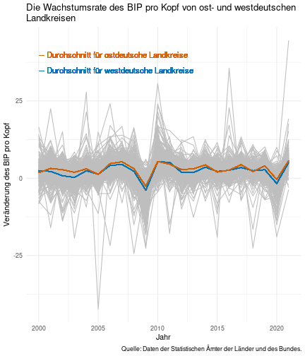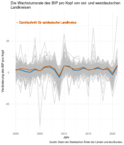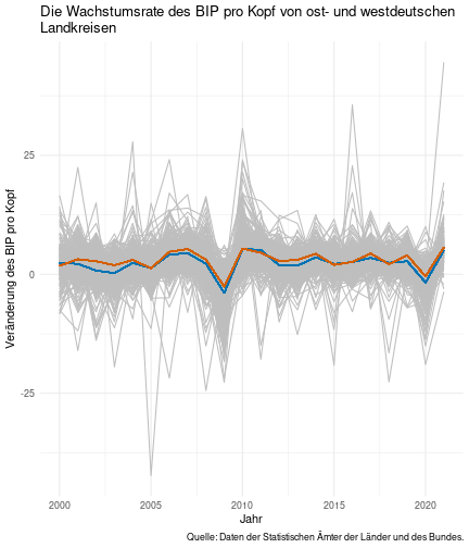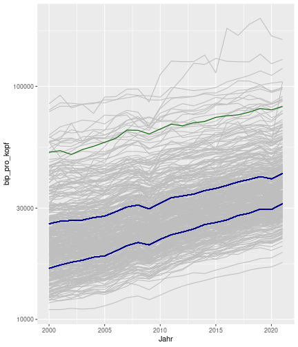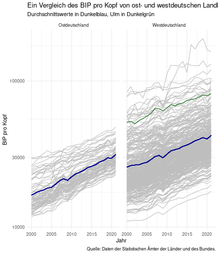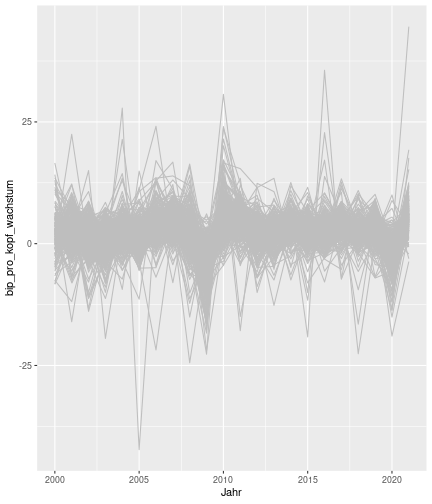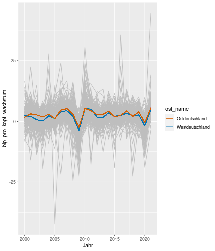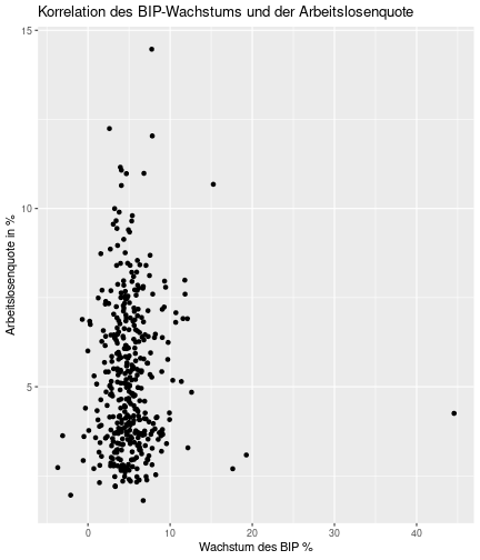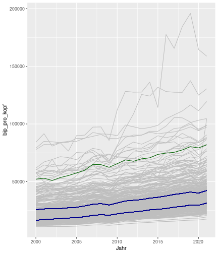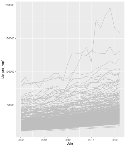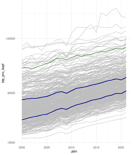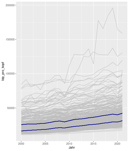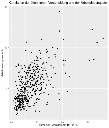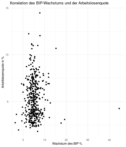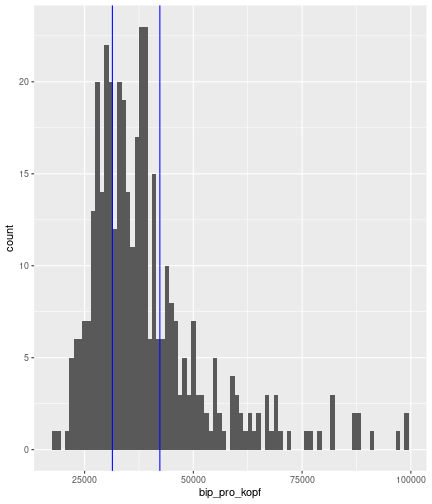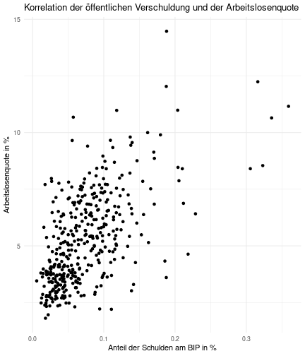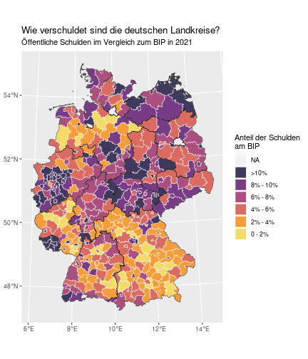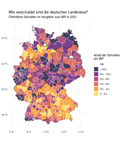 class: center, middle, inverse, title-slide .title[ # Case-Study zur Arbeitslosigkeit in Deutschland ] --- <style type="text/css"> .remark-code{line-height: 1.5; font-size: 80%} @media print { .has-continuation { display: block; } } </style> ## Organisatorische Hinweise - Viele Deadlines - Ungewohntes Format (sehr technisch) - Github, RStudio, R - Arbeitsschritte mit Github (3. Problem Set von Github herunterladen und lösen) .alert[Dies ist alles neu und das ist uns bewusst!] .question[Warum das Ganze?] -- - Durch die Deadlines sollten Sie sich mit dem Stoff auseinandersetzen - Github, R, RStudio und RMarkdown müssen Sie in den Projekten nutzen `\(\rightarrow\)` Üben mit RTutor - Visualisierung, Interpretation und Präsentation in den Projekten gefragt `\(\rightarrow\)` Üben mit der Case-Study --- ## Recap letzte Vorlesungseinheit - Verschiedene Arten einen Datensatz einzulesen - `readr`, `readxl`, `haven`... - Variablenbezeichnungen stehen nicht zwangsläufig in erster Spalte - Es gibt oft und viele `NA`s in echten Daten - Konsistenzchecks wichtig - Datensätze sind nicht immer in der Form das wir diese direkt Einlesen können - Aus verschiedenen Quellen einlesen, z.B. über eine `for`-Schleife - Umformen, da die Daten im `wide`-Format vorliegen -> `pivot_longer` - Es ist wichtig sich selbst ein Bild von den Daten zu machen --- class: inverse, center, middle # Analyse der Daten --- ## Deskriptive vs. induktive Statistik - Deskriptive Statistik (beschreibende Statistik) ist beschreibend (wer hätte es gedacht) - Induktive (auch schließende) Statistik versucht aus der Stichprobe auf die Grundgesamtheit zu schließen -- - Keine Unterscheidung in der Formel - Keine Unterscheidung in dem Datensatz der verwendet wird -- .question[Worin genau besteht der Unterschied zwischen der deskriptiven und der induktiven Statistik?] --- ## Deskriptive Statistik - Beschreibung des Datensatzes - **Beispiel:** Daten von der Agentur für Arbeit über die Arbeitslosenquote in den Landkreisen - Mehrere Arten denkbar - Tabellenform - Visualisierung mittels Schaubildern .instructions[Sie wollen etwas über ihren aktuellen Datensatz lernen] --- ## Induktive Statistik - Interesse gilt nicht dem Datensatz selbst, sondern der Population - Sie haben keine Vollerhebung durchgeführt, sondern nur eine (zufällige) Stichprobe der Population gezogen - **Beispiel:** Mikrozensus, d.h. eine Befragung von zufällig ausgewählten Haushalten in Deutschland - Sie wollen aus der Stichprobe schätzen, wie sich die beobachtete Größe in der Population verhält - Es gibt viele Arten der induktiven Statistik. Die zwei häufigsten: - Vorhersage - Erkennen kausaler Zusammenhänge -- .alert[In die induktive Statistik tauchen wir nächstes Semester tiefer ein.] --- class: inverse, center, middle # Deskriptive Statistik --- ## Univariate deskriptive Statistik - Eine Variable wird dargestellt: - Verteilung - Mittelwert - Standardabweichung - Median - Quantile - Überblick verschaffen, Eigenschaften der Variablen aufzeigen --- ## Univariate deskriptive Statistik - Darstellung über eine Tabelle - Median, Mittelwert, Standardabweichung und Quantile - Darstellung über einen Boxplot - Median, Inter-Quartile-Range (ICR), Ausreißer - Darstellung über ein Histogram - Verteilung mit Anzahl an Beobachtungen - Darstellung über einen Kerndichteschätzer - Verteilung mit Dichte --- ## Univariate deskriptive Statistik (Boxplot) <img src="./figs/boxplot-explanation-1.png" width="80%" /> --- ## Bivariate deskriptive Statistik Darstellung von Zusammenhängen zweier Variablen - Korrelation zweier Variablen - Wenn sich eine Variable verändert, wie verändert sich die andere Variable? Darstellung als: - Streudiagramm - Korrelationskoeffizient (meist innerhalb eines Korrelationsmatrix) --- class: inverse, center, middle # Wie sieht die deskriptive Statistik in der Praxis aus? --- ## Zweiter Teil der Case Study Eingelesene Daten deskriptiv untersuchen - Erster Schritt: Deskriptive Tabellen mit `kableExtra` und `gt` - Zweiter Schritt: Grafiken mit `ggplot2` -- Ziele des zweiten Teils der Case Study: - Daten visualisieren und Zusämmenhänge grafisch veranschaulichen - Deskriptive Analysen mittels Korrelationstabellen und deskriptiven Tabellen anfertigen - Das Verständnis wie Sie ihre Informationen zu bestimmten Fragestellungen möglichst effektiv aufbereiten - Interaktive Grafiken erstellen -- .alert[Im dritten RTutor Problem Set werden Sie Visualisierung zu einzelnen Ländern auf europäischer Ebene.] --- ## Daten und Pakete laden Wir laden die aus Teil 1 erstellten Datensätze: ```r library(tidyverse) library(skimr) library(sf) library(viridis) library(plotly) library(kableExtra) library(gt) library(corrr) ``` ```r # Daten einlesen #einkommen <- readRDS("../case-study/data/einkommen.rds") bundesland <- readRDS("../case-study/data/bundesland.rds") landkreise <- readRDS("../case-study/data/landkreise.rds") bip_zeitreihe <- readRDS("../case-study/data/bip_zeitreihe.rds") gemeinden <- readRDS("../case-study/data/gemeinden.rds") gesamtdaten <- readRDS("../case-study/data/gesamtdaten.rds") schulden_bereinigt <- readRDS("../case-study/data/schulden_bereinigt.rds") ``` --- class: inverse, center, middle # Deskriptive Analysen --- ## Arbeitslosenquote berechnen .instructions[**Zuerst:** Überblick über die Daten gewinnen] - Wie viele Landkreise haben wir in den Daten? - Wie ist die Verteilung der Schulden, Arbeitsenquote und des BIP? -- Hierzu müssen wir erst noch die Arbeitslosenquote berechnen: `\(Arbeitslosenquote = Erwerbslose / (Erwerbstätige + Erwerbslose)\)` ```r # Zuerst wollen wir uns noch die Arbeitslosenquote pro Landkreis berechnen gesamtdaten <- gesamtdaten %>% mutate(alo_quote = (total_alo / (erw+total_alo))*100) ``` --- ## Anzahl an Beobachtungen **Quick and dirty**(einfacher Tibble Datensatz): Einen Blick auf die Anzahl an Erwerbstätigen und Einwohnern in Deutschland werfen. ```r # Wie viele Erwerbstätige und Einwohner (ohne Berlin, H
