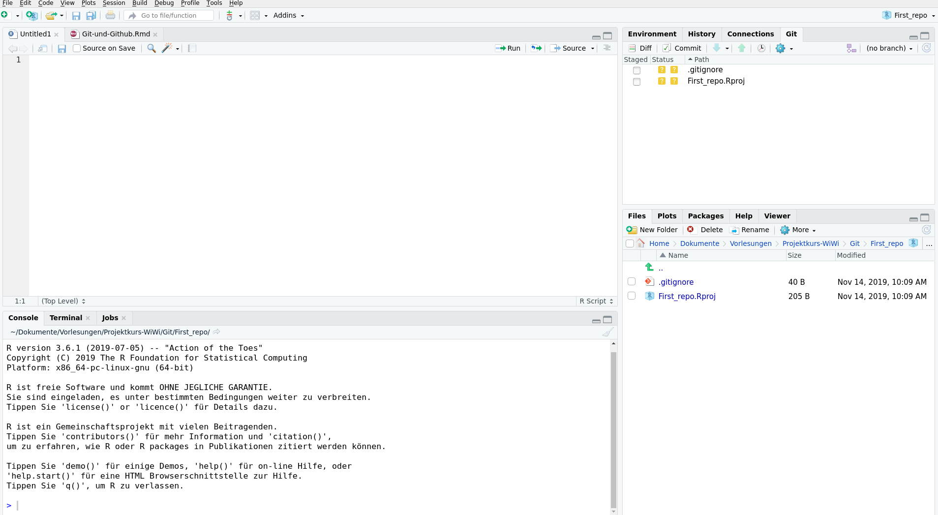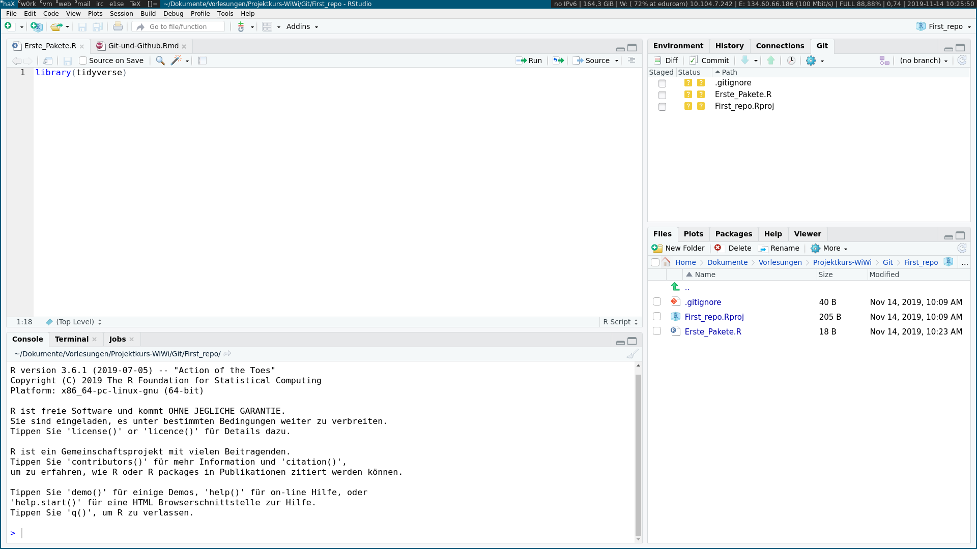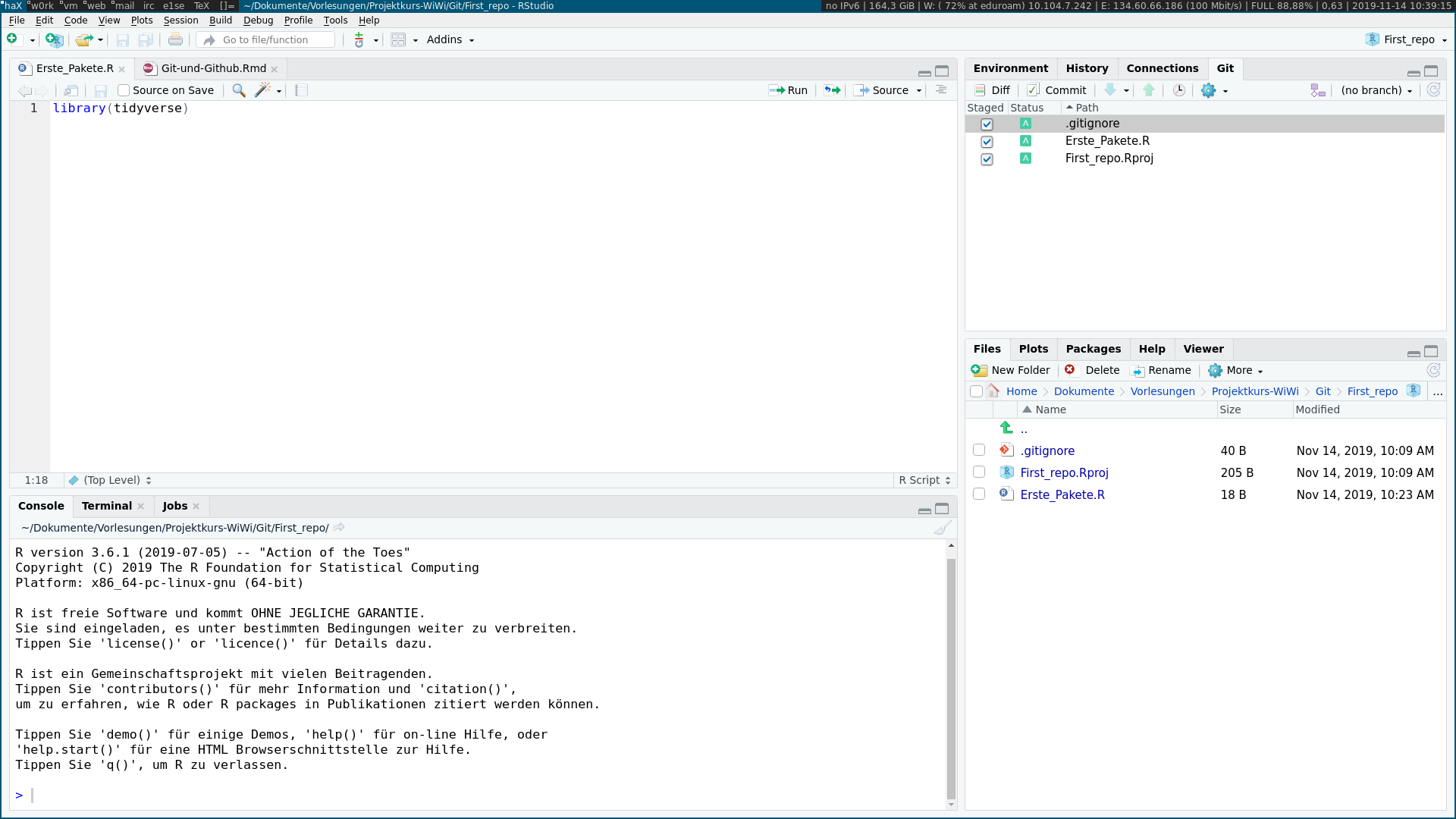 library(tidyverse) ein und speichern diese abLokal gespeicherte Dateien sind nicht automatisch mit dem Github Repositorium gesynched!