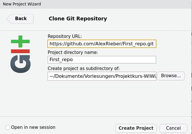 Bei eigenen Projekten außerhalb des Projektkurses haben Sie i.d.R. kein Github Repositorium, welches Sie klonen können. Deshalb hier noch kurz erklärt, wie Sie ein lokales Repositorium mit git und github synchen können.