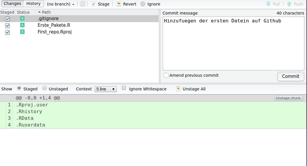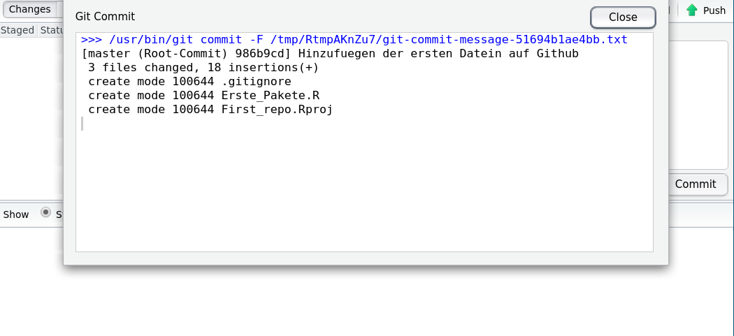 git push ausführen um die Änderungen zu synchronisieren, dies können Sie auch in RStudio machen und brauchen nicht in die Kommandozeile wechseln!
